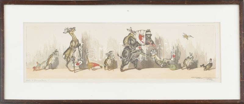 Beschreibung: Boris O'Klein (1893-1985): Soir L'Ouverture. (Esti megnyitó) Karikatúra. Színezett rézkarc, papír, jelzett. Fakeretben. 14x43cm
