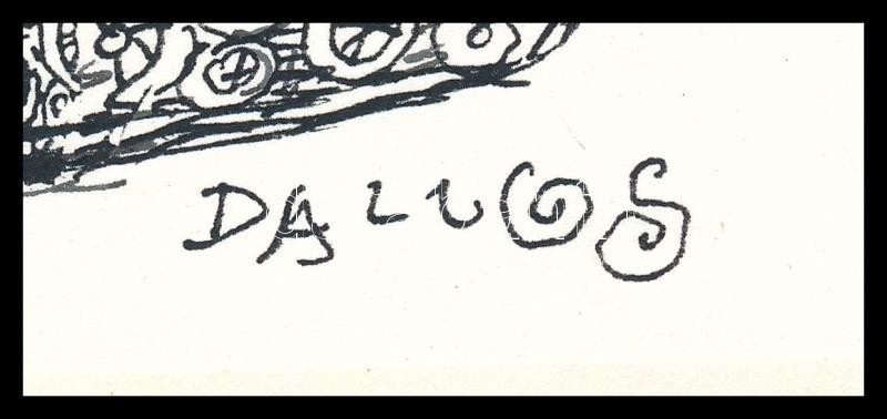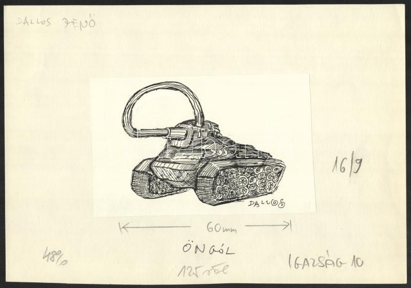 Beschreibung: Dallos Jenő (1940-2021): Öngól (1956). Tus, papír, jelzett, kartonra kasírozva. Az Igazság c. lapban megjelent karikatúra. 10,5x16,5 cm.