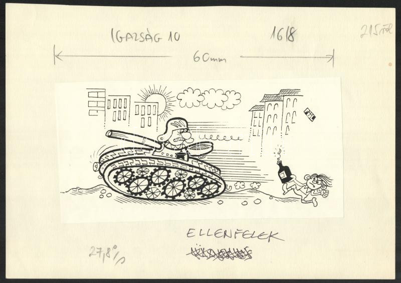 Beschreibung: Fülöp György (1923-): Ellenfelek (1956). Tus, papír, jelzett, kartonra kasírozott. Az Igazság c. lapban megjelent karikatúra. 11x22 cm.