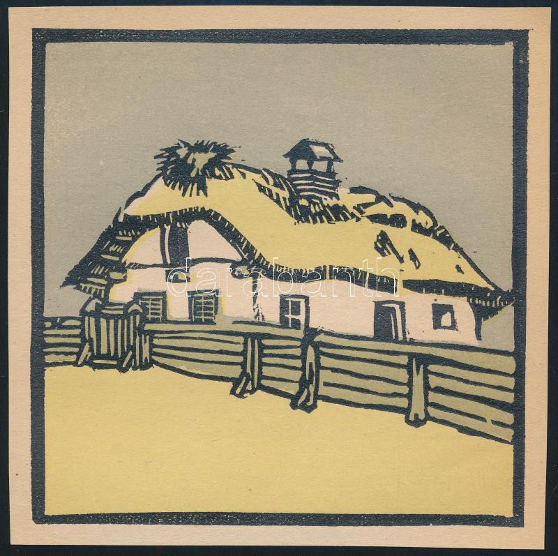 Beschreibung: Kós Károly (1883-1977): Erdélyszéli kisnemesi porta. Linómetszet, papír, jelzés nélkül, körbevágott, 10x10 cm