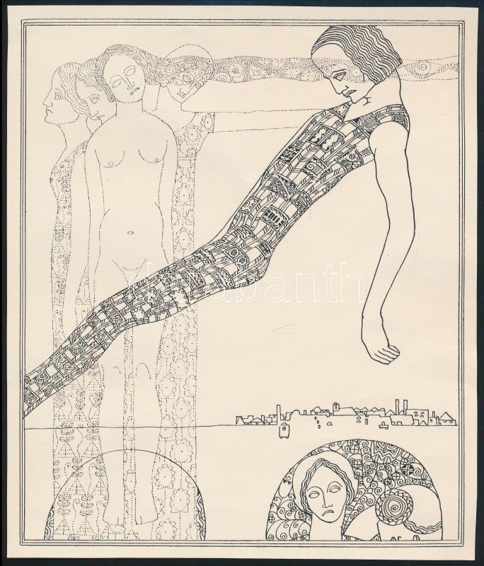 Beschreibung: Kozma Lajos (1884-1948): A múlt. Cinkográfia, papír, jelzett a cinkográfián, körbevágott, 19,5×16,5 cm