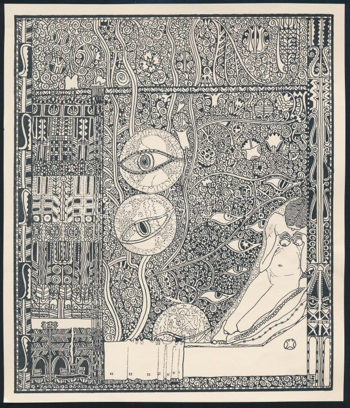 Beschreibung: Kozma Lajos (1884-1948): Figyelő szemek. Cinkográfia, papír, jelzett a cinkográfián, körbevágott, 19,5×16,5 cm