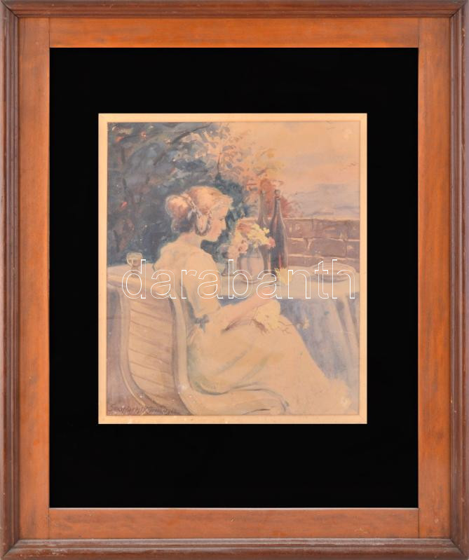 Beschreibung: Schaffartzik Jenő: Teraszon ülő nő. 1912. Akvarell, papír. Üvegezett, sérült keretben. 40x35 cm