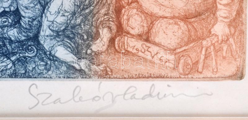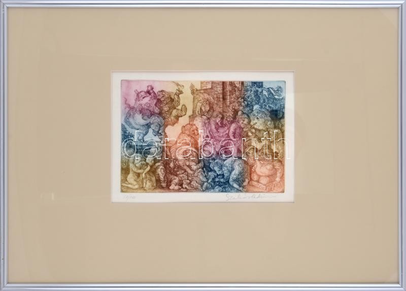 Szabó Vladimír (1905-1991): Zenélő társaság. Színes rézkarc, papír, jelzett. Számozott: 10/100. Üvegezett keretben, 19,5×28,5 cm / Vladimír Szabó (1905-1991): Party with music. Coloured etching on paper, signed. Numbered: 10/100. Framed with glass, 19,5×28,5 cm