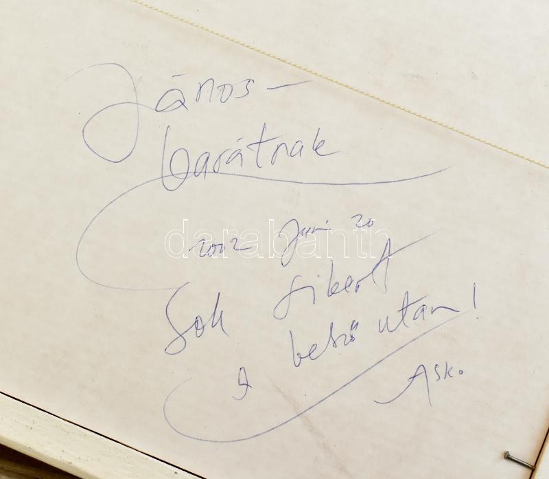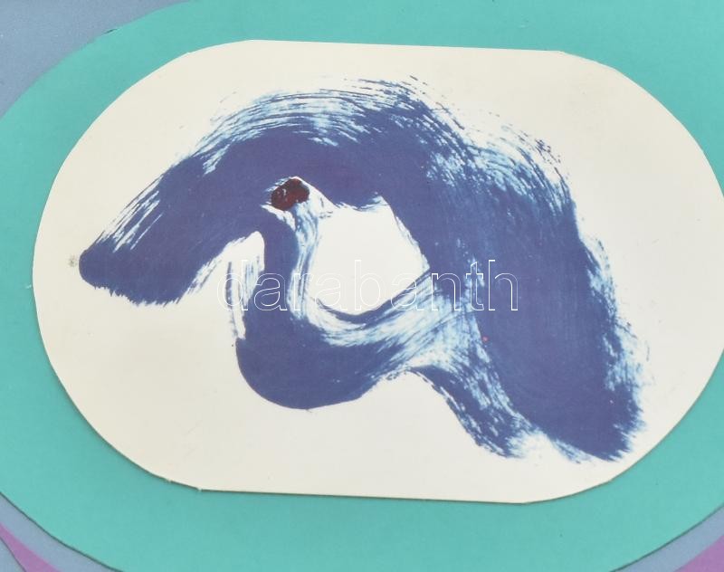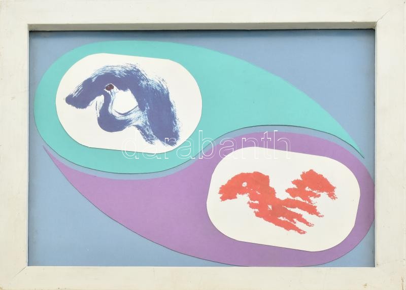 ASK jelzéssel: Absztrakt kompozíció. Ofszet, kollázs. Üvegezett fa keretben, hátoldalán ajánlással, 23,5x18,5 cm