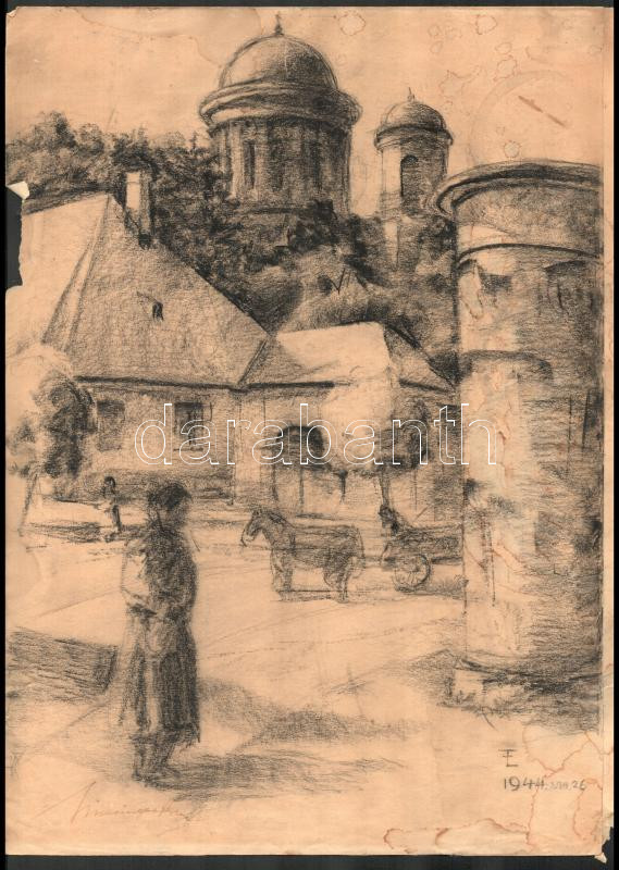 Beschreibung: FL jelzéssel: Esztergomi részletek, 1944-45, 2 db rajz. Lavírozott tus ill. szén, papír, foltos. sérült. 29x40 cm.