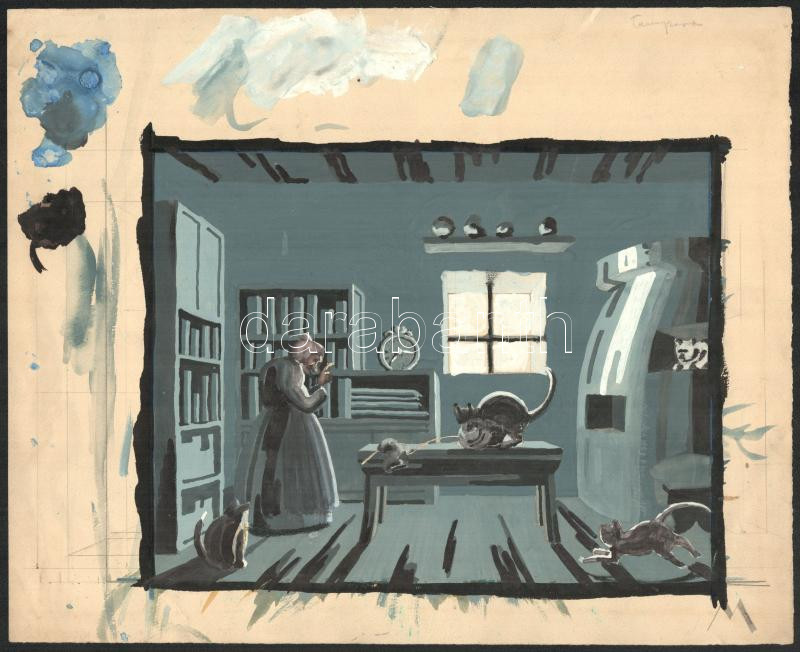 Jelzés nélkül: Art deco díszlet-, illusztráció vagy enteriőrterv, 1925-30 körül. Tempera, papír. Jelzés nélkül, feltehetően Galambos Margit alkotása. 16x20 cm.