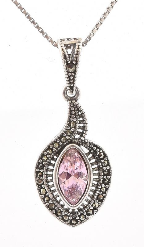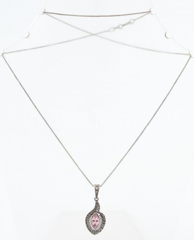 Beschreibung: Ezüst(Ag) venezianer nyaklánc rózsaszín köves medállal, jelzett, h: 50 cm, bruttó: 4,6 g
