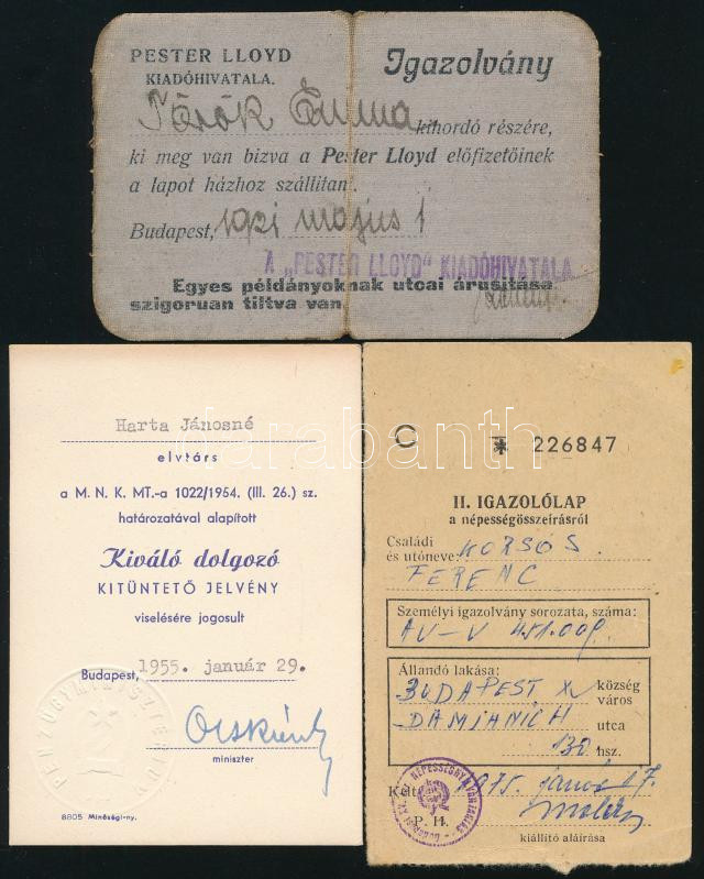 1921-1975 3 db igazolvány: 1921 Pester Lloyd Kiadóhivatal igazolványa újságkihordó részére + 1955 Kiváló dolgozó kitüntetés viselésére jogosító igazolvány, Olt Károly pénzügyminiszter aláírásával, szárazbélyegzővel + 1975 II. Igazolólap a népességösszeírásról