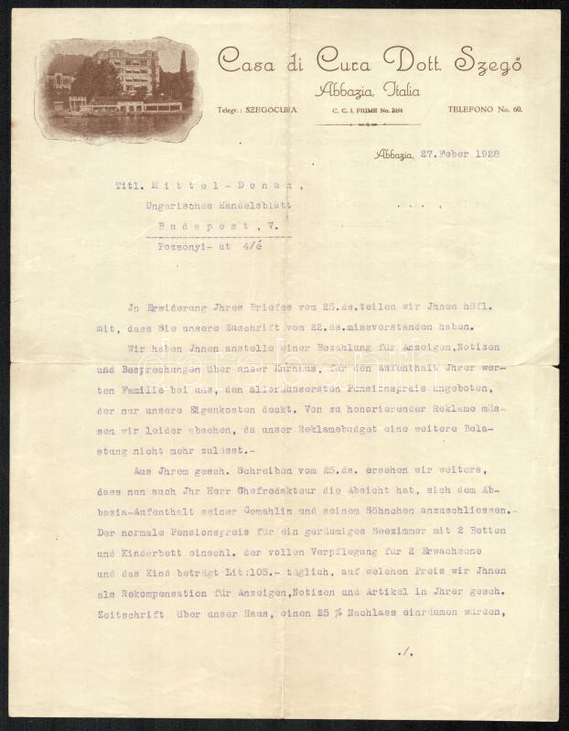 1928 Abbázia, "Casa di Cura Dott. Szegő" fejléces levélpapír... https://www.darabanth.com/de/429-Fernauktion/429.0/Kunst-Dokumente-andere-Sammelgebiete/Dokument~500019/1928-Abbazia-Casa-di-Cura-Dott-Szego-fejleces-levelpapirjara-irt-level~II2750926