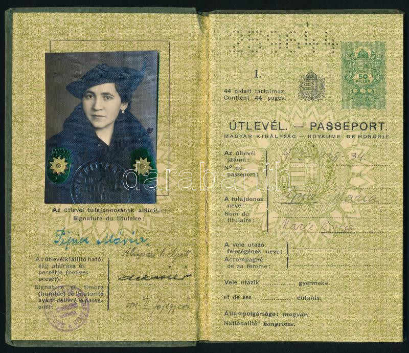 1938 A Magyar Királyság fényképes útlevele, román bélyegzésekkel, jó á... https://www.darabanth.com/de/429-Fernauktion/429.0/Kunst-Dokumente-andere-Sammelgebiete/Dokument~500019/1938-A-Magyar-Kiralysag-fenykepes-utlevele-roman-belyegzesekkel-jo-allapotban~II2748421