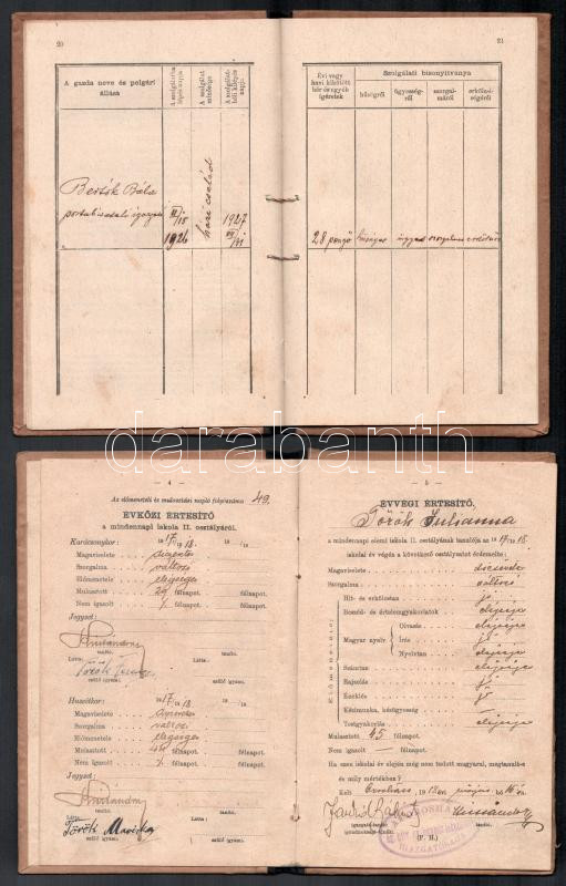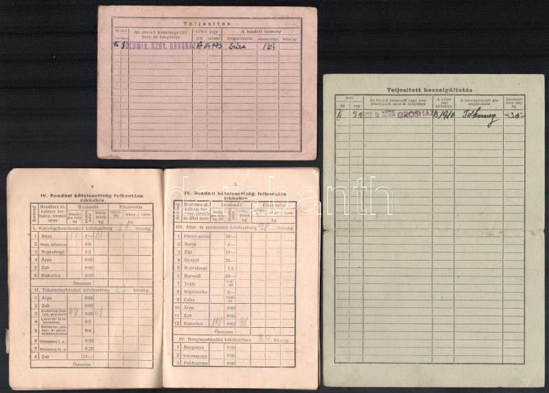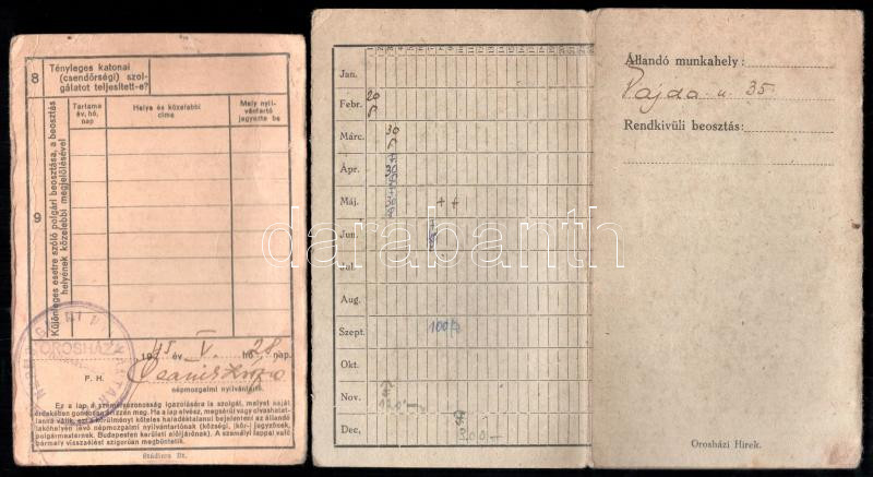 cca 1916-52 7 db Orosházához köthető okmány: 1926 fényképes szolgálati (cseléd) könyv, 1000 korona okmánybélyeggel, 1916 Állami elemi népiskolai értesítő könyvecske, cca 1930-40 munkaellenőrző, 1945 polgári személyi lap, stb., részben sérült, helyenként kissé foltos