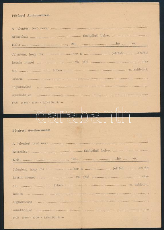cca 1960 Fővárosi Autóbuszüzem kitöltetlen bírsági jegyzékei 2 db https://www.darabanth.com/de/429-Fernauktion/429.0/Kunst-Dokumente-andere-Sammelgebiete/Dokument~500019/cca-1960-Fovarosi-Autobuszuzem-kitoltetlen-birsagi-jegyzekei-2-db~II2748536