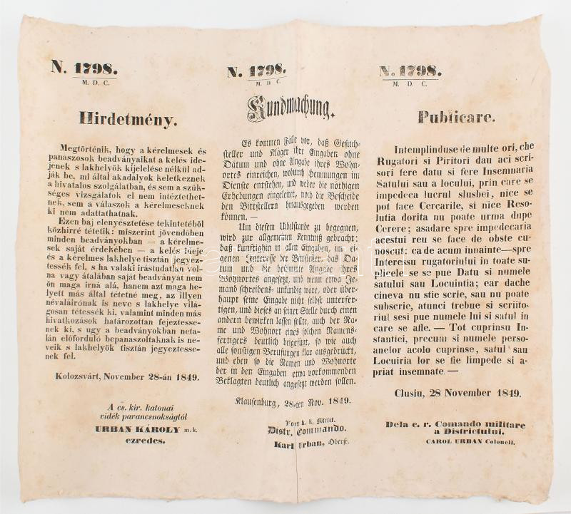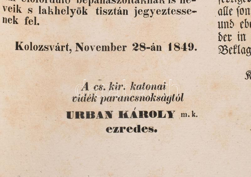 1849 Kolozsvár, cs. és királyi parancsnokság (Urban Károly ezredes) ál... https://www.darabanth.com/de/429-Fernauktion/429.0/Kunst-Dokumente-andere-Sammelgebiete/Drucksachen~1000002/1849-Kolozsvar-cs-es-kiralyi-parancsnoksag-Urban-Karoly-ezredes-altal-kiadott-haromnyelvC5~II2753235