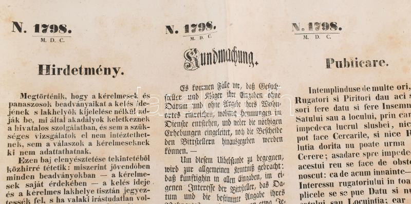 Beschreibung: 1849 Kolozsvár, cs. és királyi parancsnokság (Urban Károly ezredes) által kiadott háromnyelvű hirdetmény