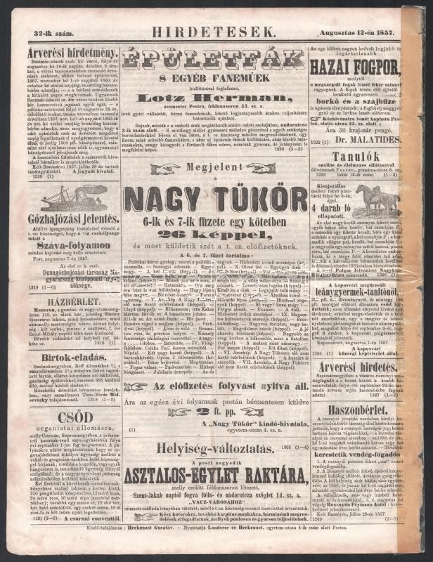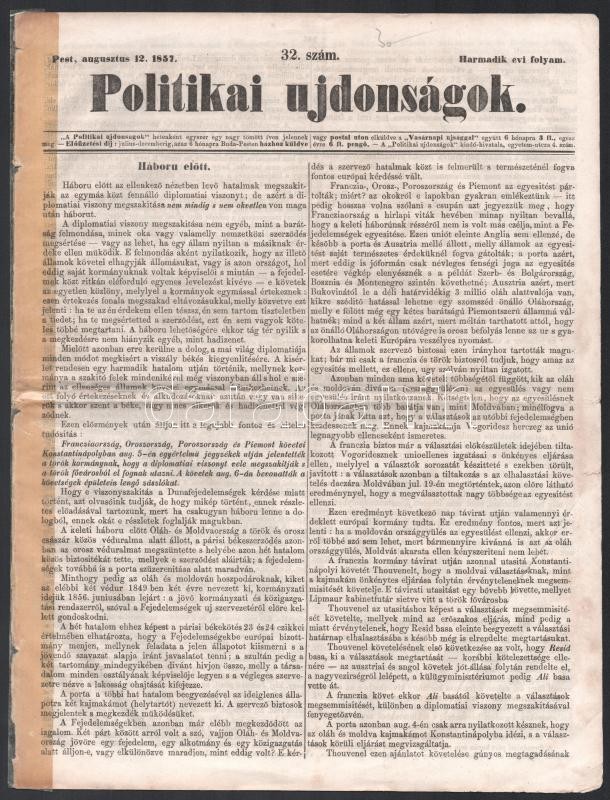 1857 Politikai ujdonságok III. évf. 32. sz., 1857. aug. 12., szerk.: P... https://www.darabanth.com/de/429-Fernauktion/429.0/Kunst-Dokumente-andere-Sammelgebiete/Drucksachen~1000002/1857-Politikai-ujdonsagok-III-evf-32-sz-1857-aug-12-szerk-Pakh-Albert-Pest-Landerer-~II2719806