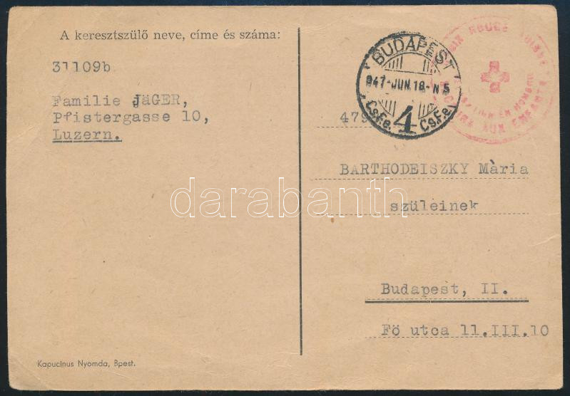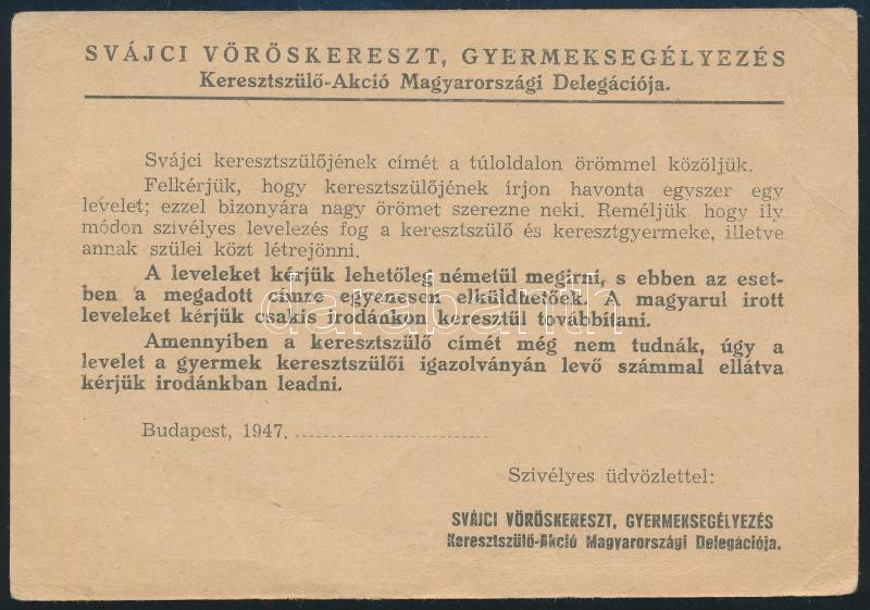 Beschreibung: 1947 Bp., Svájci Vöröskereszt Gyermeksegélyezés Keresztszülő-Akció Magyarországi Delegációja levelezőlap, bélyegzéssel