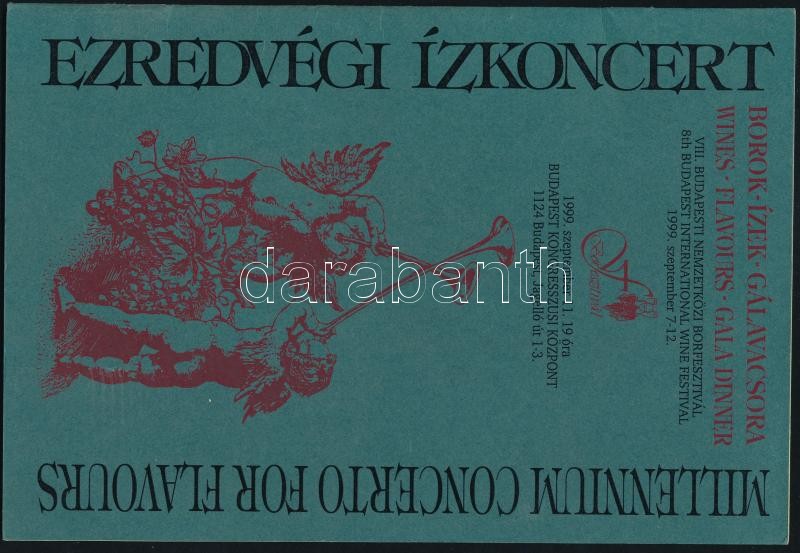 1999 Ezredvégi ízkoncert - borok, ízek, gálavacsora, Budapesti Kongres... https://www.darabanth.com/de/429-Fernauktion/429.0/Kunst-Dokumente-andere-Sammelgebiete/Drucksachen~1000002/1999-Ezredvegi-izkoncert-borok-izek-galavacsora-Budapesti-Kongresszusi-Kozpont-programfu~II2717650