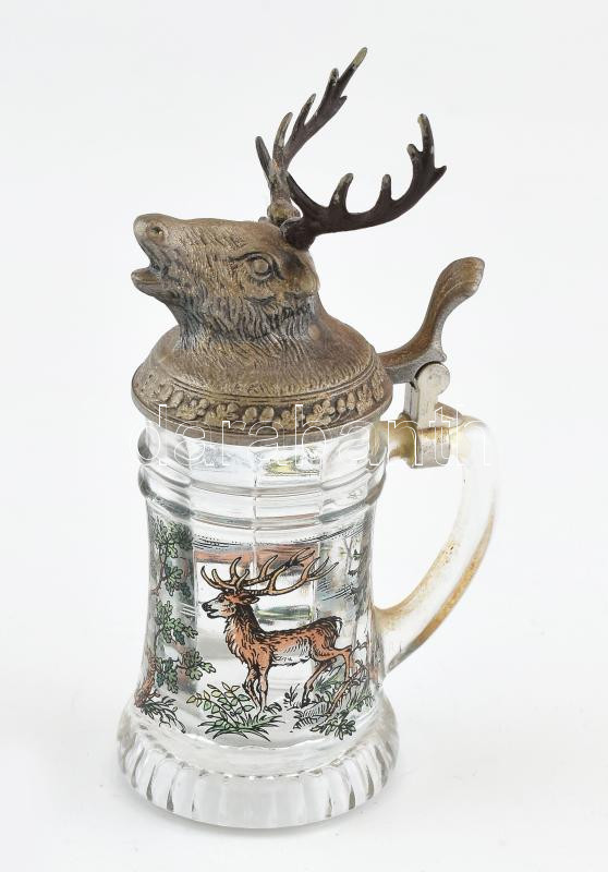 Beschreibung: Vadász motívumos német pálinkás kupica / mini korsó, szarvasfejes fém fedéllel, matricás mintával. Jelzett, m: 12 cm