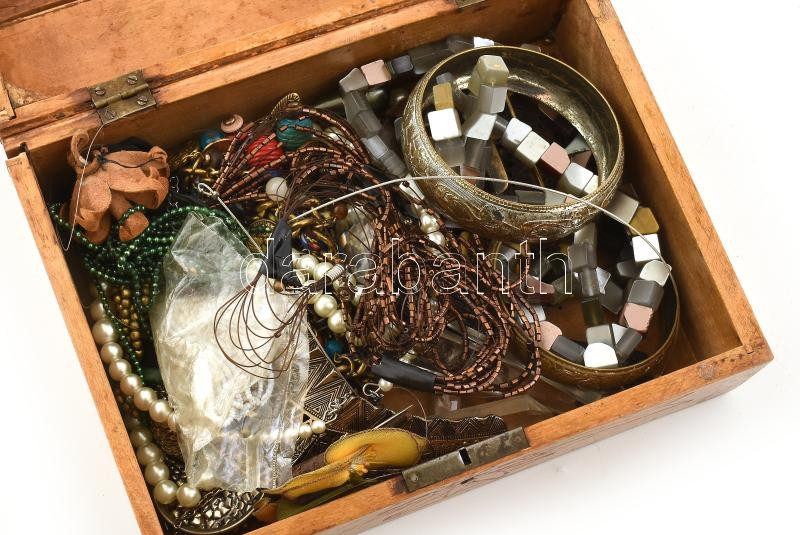 Beschreibung: Vegyes bizsu tétel, Csorbató feliratos régi fadobozban, kopott, 16x22cm