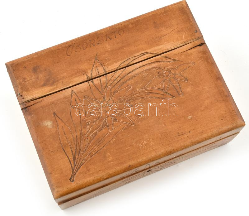 Vegyes bizsu tétel, Csorbató feliratos régi fadobozban, kopott, 16x22c... https://www.darabanth.com/de/429-Fernauktion/429.0/Kunst-Dokumente-andere-Sammelgebiete/Flohmarkt~500013/Vegyes-bizsu-tetel-Csorbato-feliratos-regi-fadobozban-kopott-16x22cm~II2752164