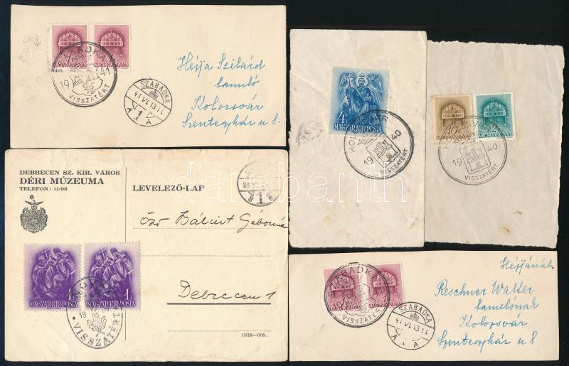 Beschreibung: 1938-1941 5 db "Visszatért" bélyegzés (Ungvár, Kolozsvár, Szabadka), levelezőlapon ill. kivágásokon