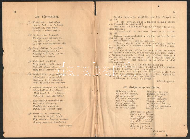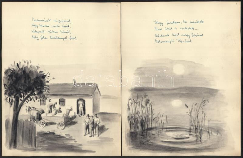 cca 1930-1940 Varga Gyula Vízimalom c. versének kézirata 8 lapon, tusrajzokkal illusztrálva. Mellékelve a Kalász Könyvkiadó Rt. III. oszt. tanulóknak kiadott olvasókönyvéből kiemelt 2 lap, amely egyikén a vers írásban megjelent változata olvasható. Feltehetően Varga Gyula (1905-1986) ref. lelkész, költő műve. Karton mappában, kézzel rajzolt papírborítóval. Egyes lapok mérete: 27x21 cm.