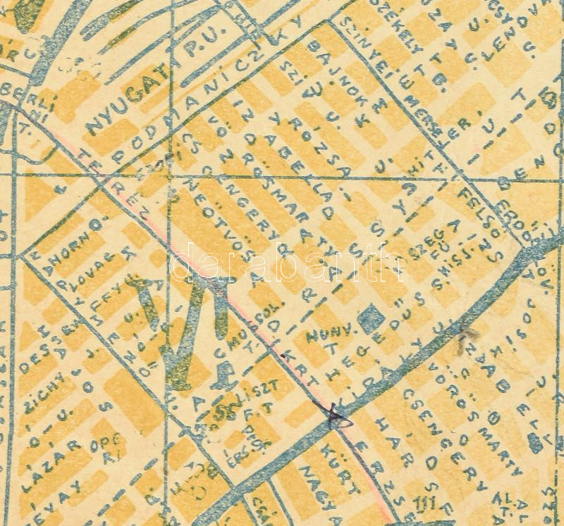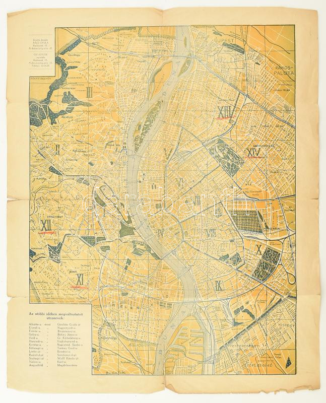 cca 1930 Budapest térképe. Tizennégy kerület, utcajegyzékkel és kerületi útmutatóval. Bp., Rácz Gyula kiadása (Ujj István-ny.), kisebb szakadásokkal, 52x42 cm
