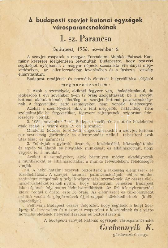 1956 A budapesti szovjet katonai egységek várparancsnoka, Grebennyik K. gárdavezérőrnagy 1. sz. parancsa, 1956. november 6-án a fegyverek kötelező leadásáról, az éjszakai kijárási tilalomról, a szovjet járőröknek való kötelező engedelmességről, a munka felvételéről, röplap