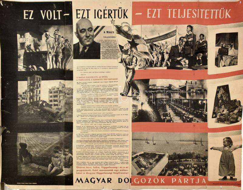cca 1950 "Ez volt - Ezt ígértük - Ez teljesítettük", Magyar Dolgozók Pártja propaganda plakát, rajta Rákosi Mátyással, fekete-fehér fotókkal, Bp., Athenaeum, sérült, hajtott, 110x85 cm