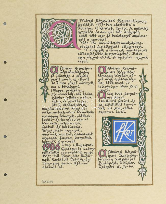 1995 Fővárosi Kézműipari Rt., kézzel festett, cégismertető reklámterv,... https://www.darabanth.com/de/429-Fernauktion/429.0/Kunst-Dokumente-andere-Sammelgebiete/Werbungen~500023/1995-Fovarosi-Kezmuipari-Rt-kezzel-festett-cegismerteto-reklamterv-lap-szele-lyukasztot~II2752153