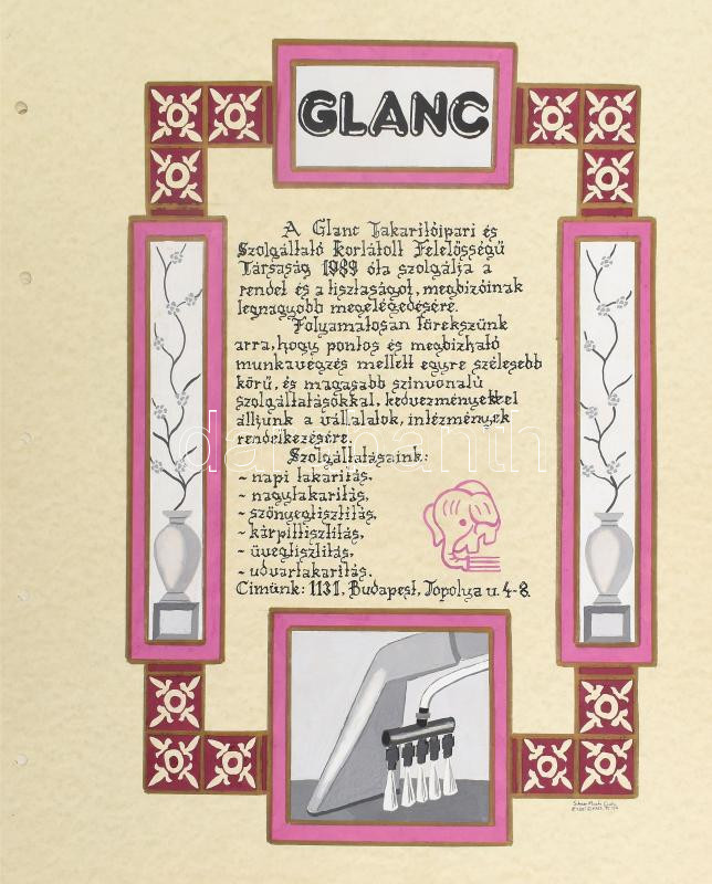 1995 Glanc Takarítóipari és Szolgáltató Kft., kézzel festett, cégismer... https://www.darabanth.com/de/429-Fernauktion/429.0/Kunst-Dokumente-andere-Sammelgebiete/Werbungen~500023/1995-Glanc-Takaritoipari-es-Szolgaltato-Kft-kezzel-festett-cegismerteto-reklamterv-lap-~II2752175