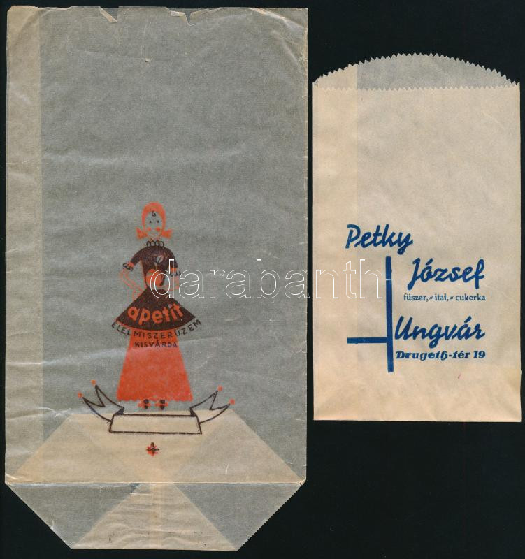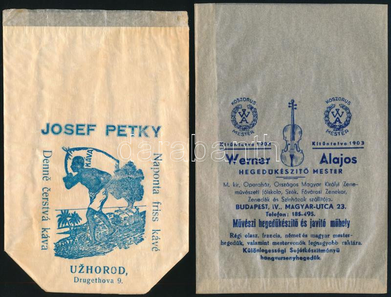 4 db kávés, cukorkás és egyéb papírzacskó (Petky József Ungvár, Werner... https://www.darabanth.com/de/429-Fernauktion/429.0/Kunst-Dokumente-andere-Sammelgebiete/Werbungen~500023/4-db-kaves-cukorkas-es-egyeb-papirzacsko-Petky-Jozsef-Ungvar-Werner-Alajos-hegedukeszC3~II2751047