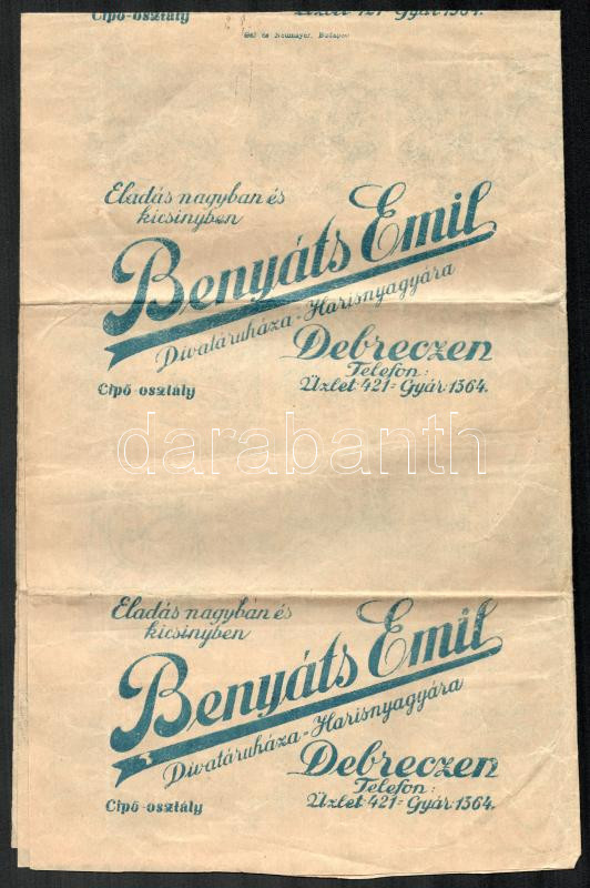 Benyáts Emil Divatáruháza - Harisnyagyára Debrecen csomagolópapír, haj... https://www.darabanth.com/de/429-Fernauktion/429.0/Kunst-Dokumente-andere-Sammelgebiete/Werbungen~500023/Benyats-Emil-Divataruhaza-Harisnyagyara-Debrecen-csomagolopapir-hajtva-rajta-tollas-feljeg~II2751054