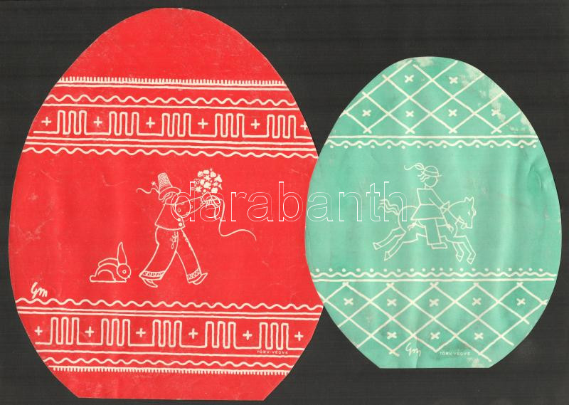 Galambos Margit (?-?): 3 db art deco húsvéti csokoládé vagy egyéb édesség csomagolás terve, 1920-as évek. Nyomat, papír, jelzett a nyomaton, részben sérült, 17x14 és 28x23,5 cm közötti méretekben.