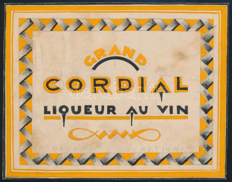 Grand cordial liqueur au vin, magyar gyártmány, art deco italcímke terv, 1925-1930 körül. Tempera, ceruza, tus, papír. Jelzés nélkül, feltehetően Galambos Margit (?-?) alkotása. Foltos. 9x11 cm.