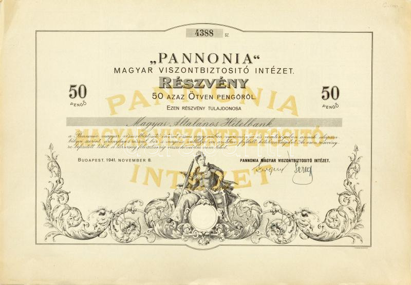 Budapest 1941. "Pannónia Magyar Viszontbiztosító Intézet" névre szóló részvénye 50P-ről, szárazpecséttel, szelvényekkel, vízjeles papíron T:I-,II egyik saroknál, széleken gyűrődés