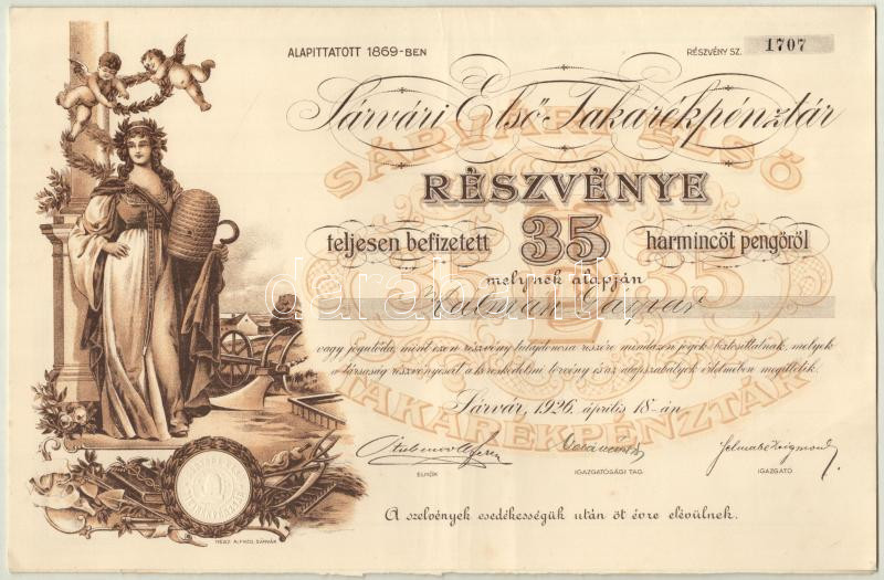 Sárvár 1926. "Sárvári Első Takarékpénztár" névre szóló részvénye 35P-ről, szelvényekkel, szárazpecséttel T:III / Hungary / Sárvár 1926. "Sárvári Első Takarékpénztár" savings bank's share with shareholder's name about 35 Pengő, with coupons and embossed stamp C:F