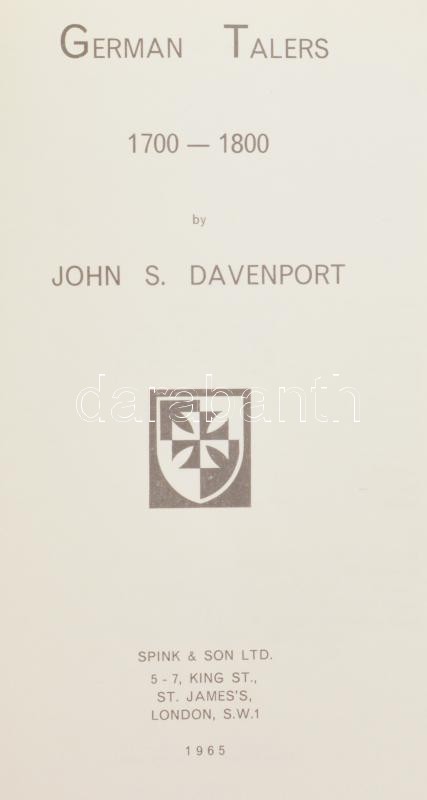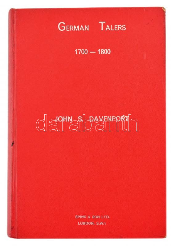 John S. Davenport: German Talers 1700-1800. - Második kiadás, 1965-ös árlista melléklettel. Spink & Son Ltd., London, 1965. Használt, jó állapotú könyv, a keménykötéses borító több helyen sérült.