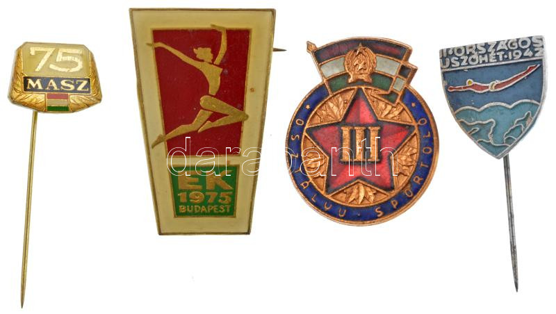 1942. "II. Országos Úszóhét" festett Al jelvény, hátoldalán "Terv.: Magyarász" és "Ludvig Bp." gyártói jelzés + ~1950. "III. Osztályú Sportoló" zománcozott fém kitüntető jelvény + 1972. "75 éves a Magyar Atlétikai Szövetség" műgyantás fém jelvény + 1975. "EK 1975 Budapest" zománcozott, aranyozott jelvény T:1-2