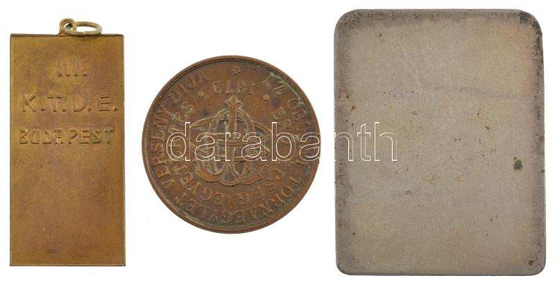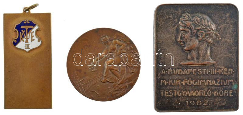 ~1910. "III. Kerületi TVE" kétoldalas bronz emlékérem zománcozott klubcímerrel, füllel (20x40mm) + ~1930. "Az Óbudai Tornaegylet Verseny Díja - Erő Épség Egyetértés 1872" Br sport díjérem füllel (30mm) + 1902. "A budapesti III. ker. M. Kir. Főgimnázium Testgyakorló Köre - 1902" ezüstözött bronz plakett (35x44mm) T:1-,2
