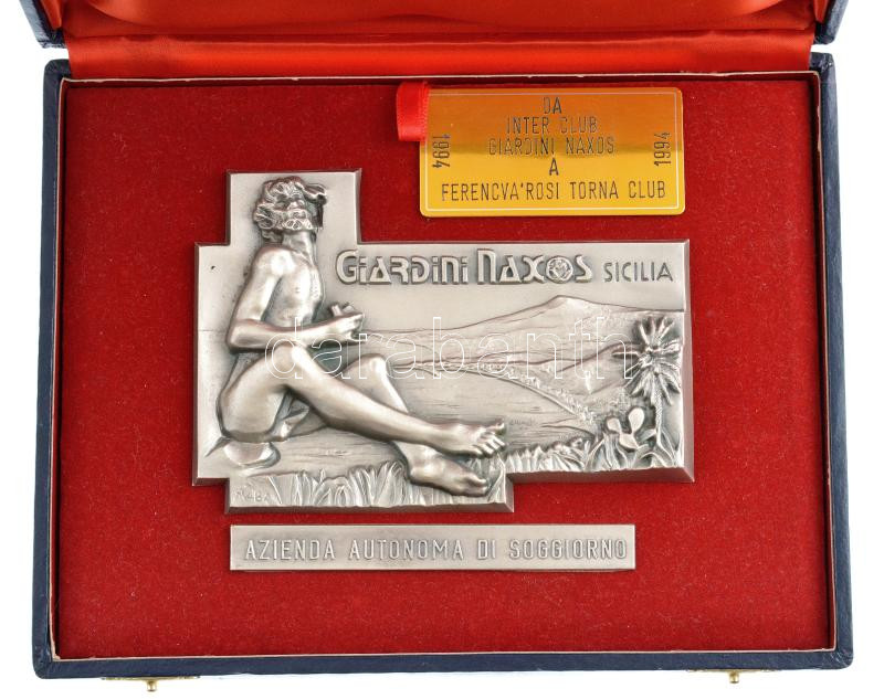 Olaszország 1994. "Az Inter Club Giardini Naxostól a Ferencvárosi Torna Clubnak - Giardini Naxos Sicilia" ezüstpatinázott fém plakett eredeti dísztokban ragasztva, táblákkal (130x90mm) T:1 / Italy 1994. "From the Inter Club Giardini Naxos to the Ferencváros Gymnastics Club - Giardini Maxos Sicilia" silver patinated metal plaque in original case, with plates (130y90mm) C:UNC