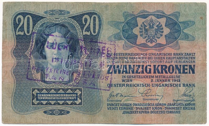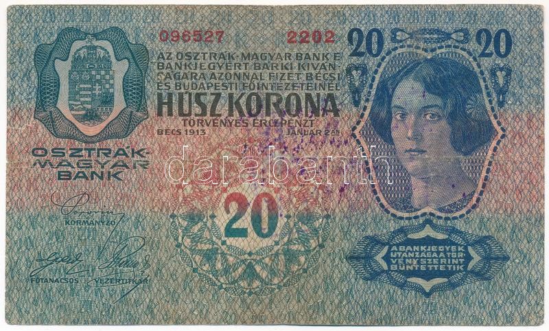 Beschreibung: 1913. 20K "2202 096527" kiolvashatatlan felülbélyegzéssel T:III szakadás