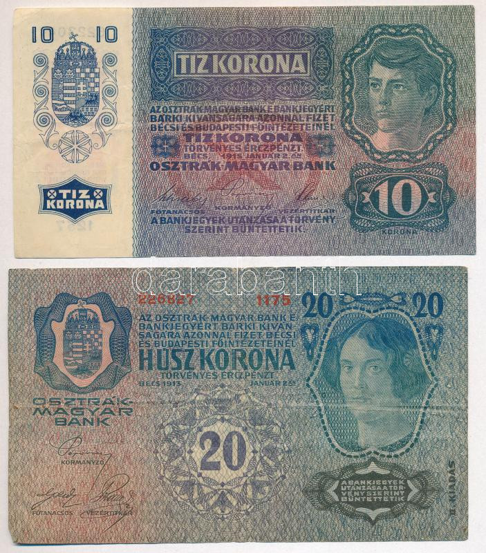1913. 20K "II. kiadás" + 1915. 10K T:III Adamo K18, K11 https://www.darabanth.com/de/429-Fernauktion/429.0/Numismatik/Ungarische-Banknoten~2000009/1913-20K-II-kiadas-plus-1915-10K-TIII-Adamo-K18-K11~II2748430