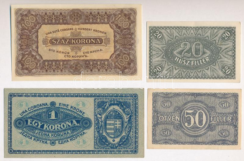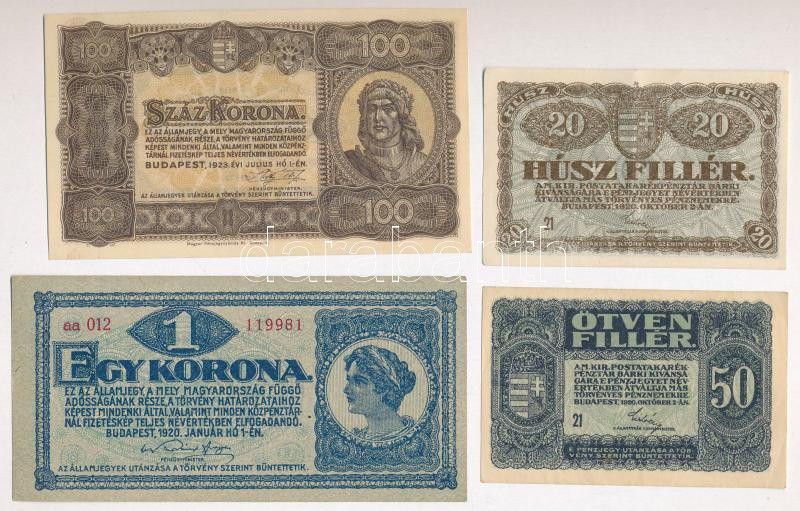 1920. 20f + 50f + 1K + 1923. 100K T:I-II https://www.darabanth.com/de/429-Fernauktion/429.0/Numismatik/Ungarische-Banknoten~2000009/1920-20f-plus-50f-plus-1K-plus-1923-100K-TI-II~II2749514