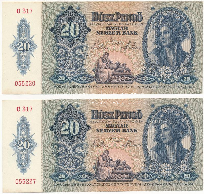1941. 20P (4x) közeli sorszámok "C 317 055220, C 317 055227, C 31... https://www.darabanth.com/de/429-Fernauktion/429.0/Numismatik/Ungarische-Banknoten~2000009/1941-20P-4x-kozeli-sorszamok-C-317-055220-C-317-055227-C-317-055232-C-317-055239-TI--Ada~II2756701