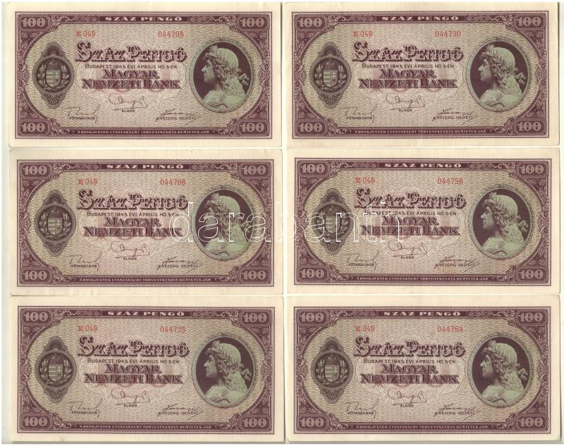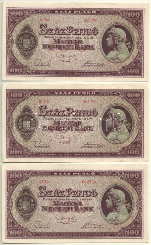 1945. 100P "E 049 044705 - E 049 044788" (9db) ebből egy sorszámkövető pár, a többi közeli sorszám) T:II-III enyhe hajtásnyomok, enyhén megtört papír, némelyiken kisebb szamárfül, és/vagy gyűrődés, egyiken nagyobb gyűrődések és beszakadások Adamo P18
