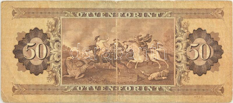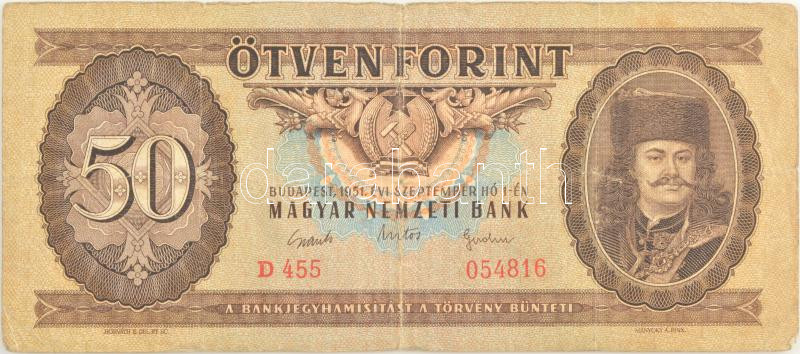 1951. 50Ft "D 455 054816" T:III,III- kis szakadás Adamo F18 https://www.darabanth.com/de/429-Fernauktion/429.0/Numismatik/Ungarische-Banknoten~2000009/1951-50Ft-D-455-054816-TIII-III-kis-szakadas-Adamo-F18~II2755059