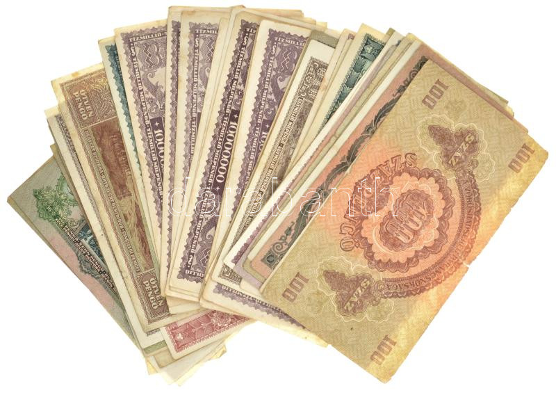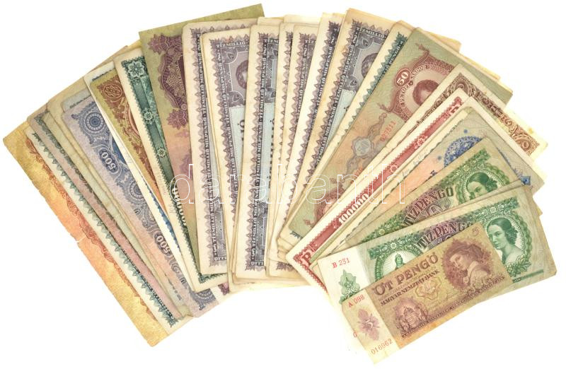 Beschreibung: 52db-os vegyes Pengő bankjegytétel, közte 1941. 20P "C 103 000202" alacsony sorszámmal és 1945. 50P T:III,III-