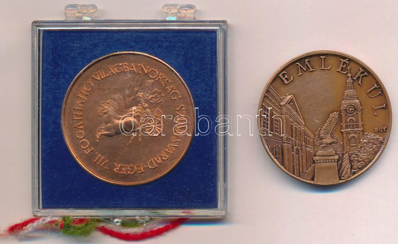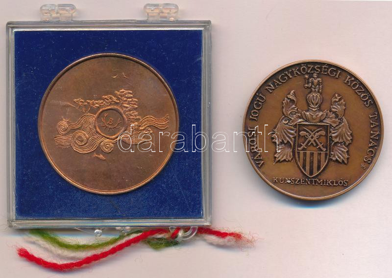 Beschreibung: Bognár György (1944-) ~1990-2000. "Emlékül / Városi Jogú Nagyközségi Közös Tanács - Kunszentmiklós" kétoldalas, bronz emlékérem (42,5mm) T:1- + Sebestyén Sándor (1949-) DN "VII. Fogathajtó Világbajnokság Szilvásvárad - Eger" Br emlékérem (42,5mm) T:1 plombált műanyag tokban